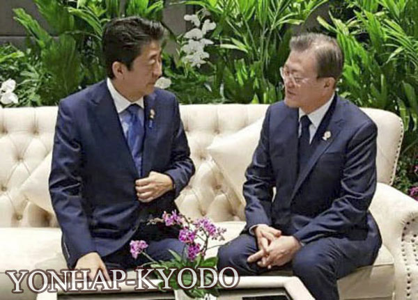 11月4日,日本首相安倍晉三在泰國曼谷郊外與南韓總統文在寅進行了約10分鐘的接觸。圍繞南韓最高法院判決日本企業賠償的前勞工訴訟案,安倍再次傳達了判決明確違反國際法的日本立場,要求韓方糾正。