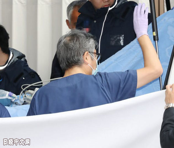 | 到達京都市內的醫院,醫護人員在搬運躺在擔架上的嫌疑人青葉(14日上午) 部分圖像經過處理 |