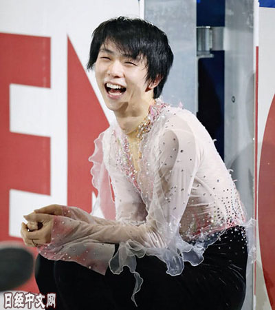 | 羽生在表演滑中露出笑容 |