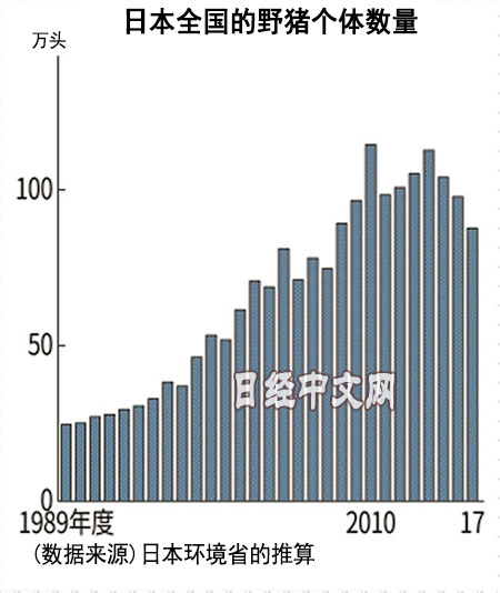 最近幾年日本的市區出現野豬的新聞越來越引人關注。地方人口過疏化等原因導致野豬的棲息地範圍擴大。日本的野豬數量在近30年間增加至3倍多,接二連三發生有人被野豬咬傷、撞傷的事件。日本中央政府和各自治體採取了驅除等對策但效果有限,專家們擔心今後不斷會有「嚮往都市生活」的野豬湧入市區的情況出現。