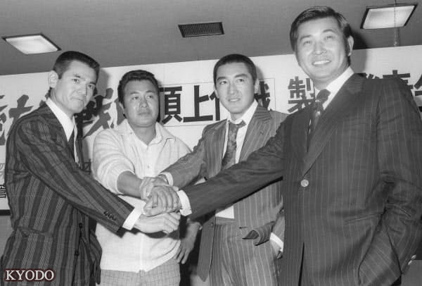 | 1973年11月,在宣佈拍攝電影《無仁義之戰 頂上作戰》時拍攝照片的(左起)菅原文太、梅宮辰夫、松方弘樹、小林旭(kyodo) |