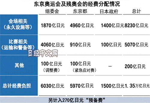 東京都的經費為5970億日元。因為競走賽場轉移到了札幌,賽場費用等30億日元從東京都轉移到組委會,組委會的經費變成6030億日元。