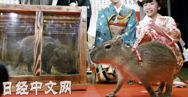 | 交接儀式上亮相的野豬和水豚(27日,大阪市通天閣) |