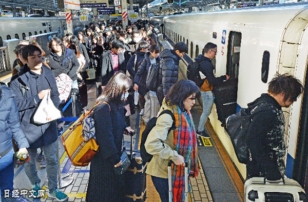 | 東海道新幹線月臺上擠滿了人(JR東京站) |