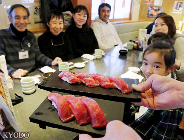 | 被拍下的鮪魚被端上壽司三昧的餐桌(1月5日,東京都中央區) |