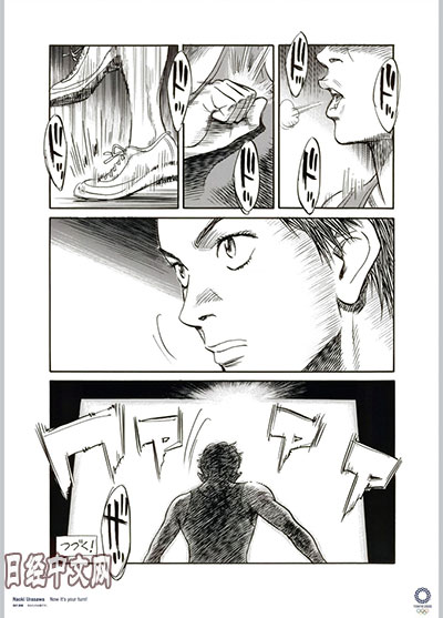 海報以漫畫、書法和照片等形式製作,奧運會為12個作品,殘奧會為8個作品。浦澤繪製了題為《該你上場了。》的漫畫,評論稱「挑戰了超越比賽、種族和性別的繪畫方式。所有人都有上場機會」。
