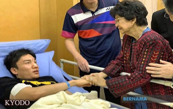 | 接受馬來西亞總理夫人(右)看望的桃田賢斗(13日,吉隆坡近郊,馬新社提供·kyodo) |