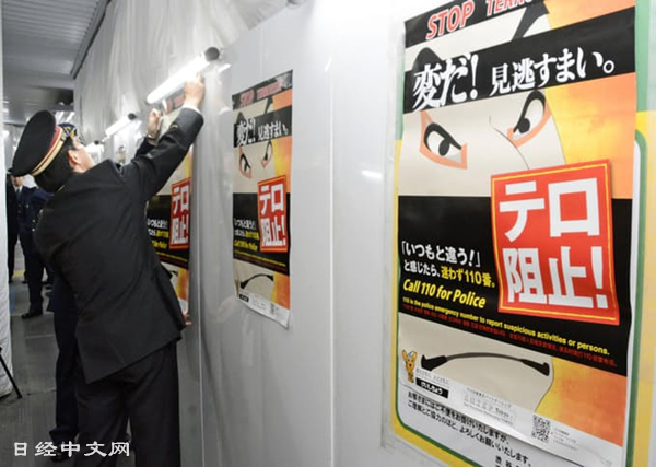 海報繪有歌舞伎演員的犀利眼神,並以中英韓語寫有「如果感覺‘與平常有異!’,請立即撥打110」字樣。海報上還印有二維碼,掃碼可進入介紹恐襲對策的主頁。