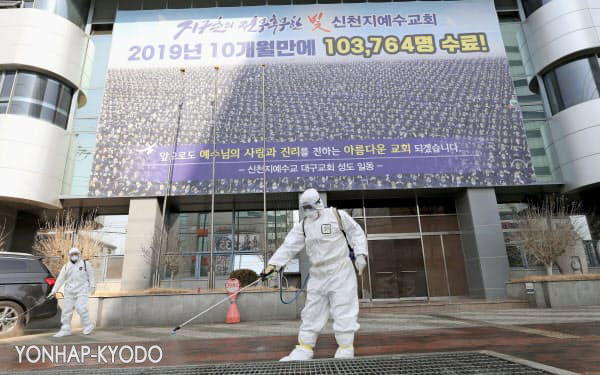| 保健所的相關人員在新天地教會相關設施前進行消毒(大邱市,2月20日,YONHAP-KYODO) |