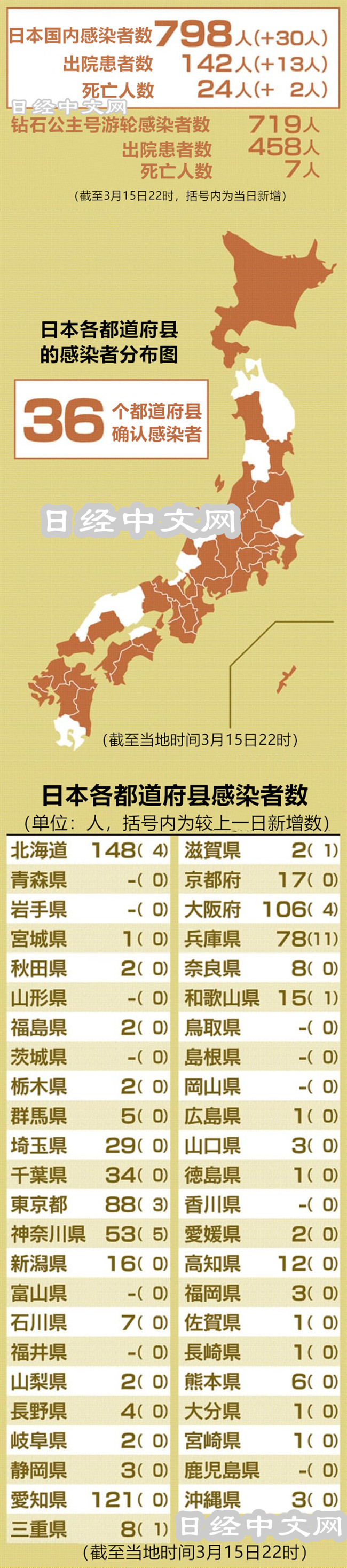 新型冠狀病毒感染的肺炎疫情在日本擴大。日本厚生勞動省和各地方政府的數據顯示,3月15日上午零時至下午10時,日本新增30人感染,累計確診病例達到798例,其中出院患者人數也累計達到142人。從日本各地區來看,共有36個都道府縣出現確診病例。
