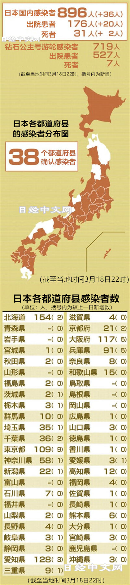 新型冠狀病毒感染的肺炎疫情在日本擴大。日本厚生勞動省和各地方政府的數據顯示,3月18日上午零時至下午10時,日本新增36人感染,累計確診病例達到896例,其中出院患者人數也累計達到176人,死亡人數新增2人,累計達到31人。從日本各地區來看,共有38個都道府縣出現確診病例。