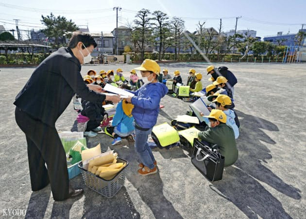 結業儀式結束後,教師在室外分發通知書,之後解散。4年級學生堀切椋平(10歲)笑著説,「一直在家都待煩了。終於見到了好久沒見的朋友」。6年級學生Katori俊(12歲)説,「我想和同班同學多呆一會兒。很多同學要到其他初中上學,我很捨不得」。