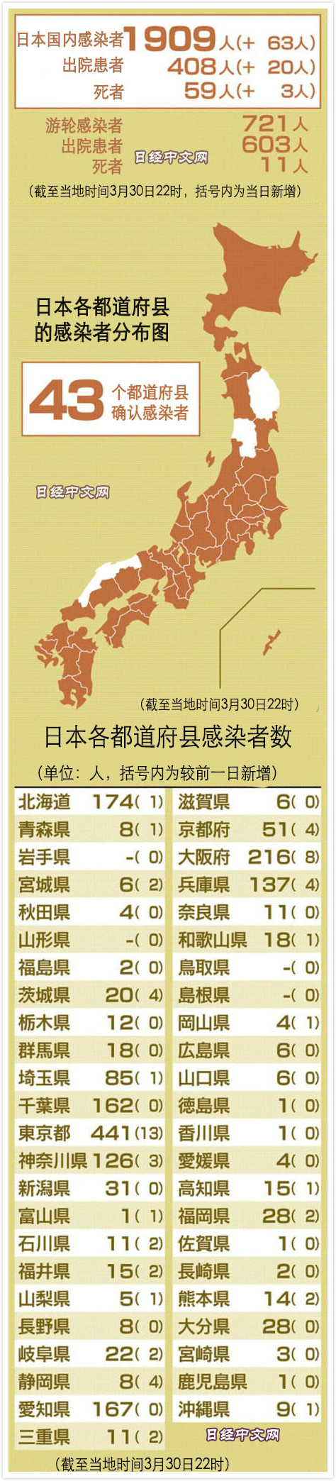 日本截至3月30日22時感染人數及分佈