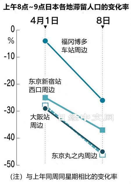 從事數據應用支援的GiXo(東京港區)基於通信運營商NTT docomo的位置資訊對滯留人口數據進行了分析,結果發現,包括東京站在內的丸之內地區4月8日上午8時~9時的人員數量與上年同一週的星期三相比減少46%。與減少22%的4月1日時相比,人員流動正逐步下降。同樣,新宿站西口的人員數量從1日的減少30%進一步下滑至減少37%。JR大阪站周邊則從30%降至45%。