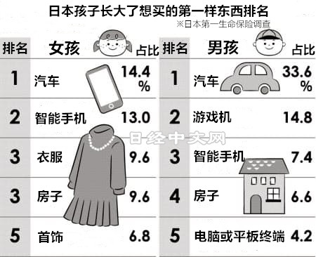 調查顯示,日本33.6%的男孩長大後想買的第一樣東西是汽車,佔絕大多數,之後依次是「遊戲機」(14.8%)、智慧手機(7.4%)。女孩子方面,想買汽車的也佔14.4%,然後依次是智慧手機(13.0%)、衣服和房子(均為9.6%)。