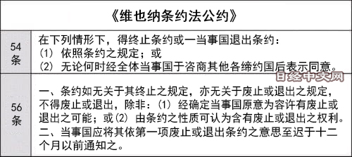要脫離沒有退出規定的條約時,根據第56條,(1)經確定當事國原意為容許有退出之可能時;(2)由條約之性質可認為含有退出之權利時——即可退出。