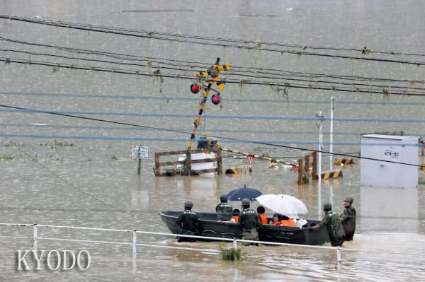 | 自衛隊通過小船救助的人(7月5日上午9時39分,熊本縣球磨村,kyodo) |