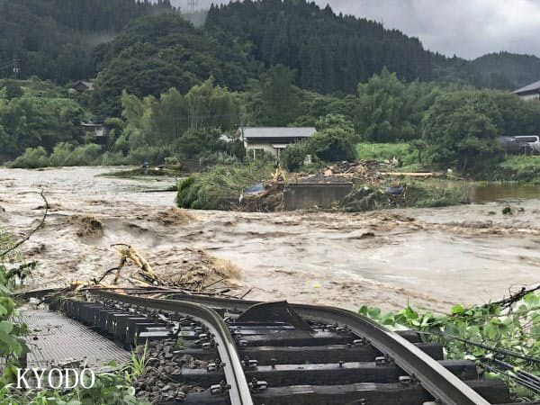 | JR久大線的鐵路橋被沖毀(7月7日上午,大分縣九重町,當地居民提供,kyodo) |