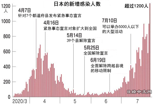 進入7月後,持續出現新增感染人數高於4~5月緊急事態宣言期間的日子。儘管如此,日本政府並未採取類似上次的舉措。日本內閣官房長官菅義偉27日也表示,「現階段並非處於需再次發佈(緊急事態宣言)、全面縮小社會經濟活動的局面」。