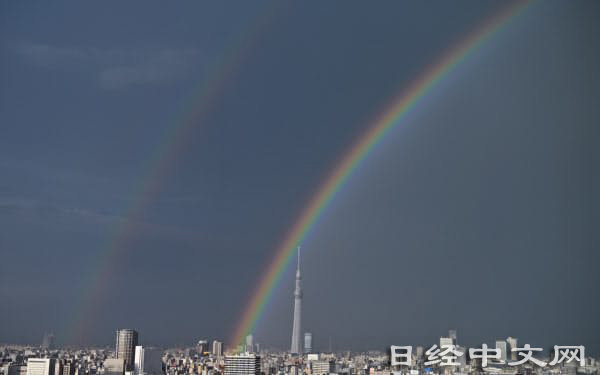 | 飛挂東京晴空塔上空的雙重彩虹(8月13日,從東京大手町望去,柏原敬樹攝) |