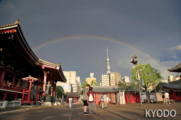 | 雷雨交加過後,飛掛在東京淺草寺上空的雙重彩虹。後面是東京晴空塔(8月13日下午,kyodo) |