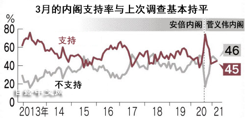 日本經濟新聞(中文版:日經中文網)與TV Tokyo于3月26~28日實施了輿論調查。結果顯示,菅義偉內閣的支持率為45%,與2月實施的上次調查持平。針對日本政府3月21日全面解除應對新冠疫情的緊急事態宣言,52%的受訪者回答「為時過早」。